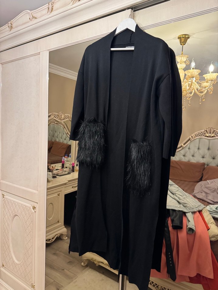 Bu siyah yün kadın hırka, uzun boy ve bol kesime sahip, uzun kolludur. Ceplerinde kürk detayları bulunur ve çıtmalı yaka tasarımıyla günlük kullanıma uygun rahat ve şık bir gotik tarza sahiptir.