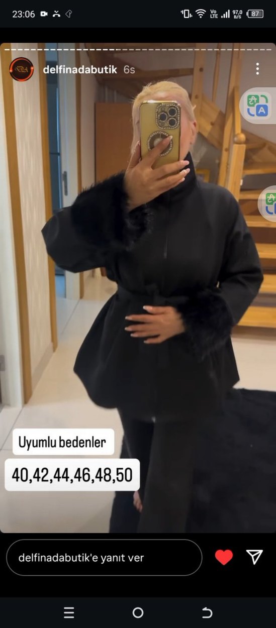 Yüksek yakalı ve uzun kollu siyah uzun kaban, kürk detaylarına sahiptir. Düzenli kesimle iş ve sokak stiline uygundur. 40-50 beden arası mevcuttur.