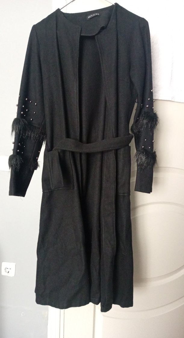Siyah uzun boy, kürklü detaylı kadın kaban, uzun kollu ve kuşaklıdır. Yumuşak ve sıcak kumaştan, rahat kesimdir.