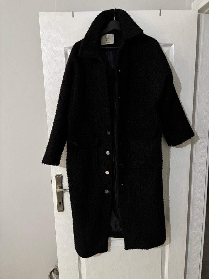 Siyah uzun palto, bol kesim ve kesik yaka detayına sahip. Yumuşak, sıcak kumaş ve kürk detayları içerir. Günlük ve sokak stili için uygundur.