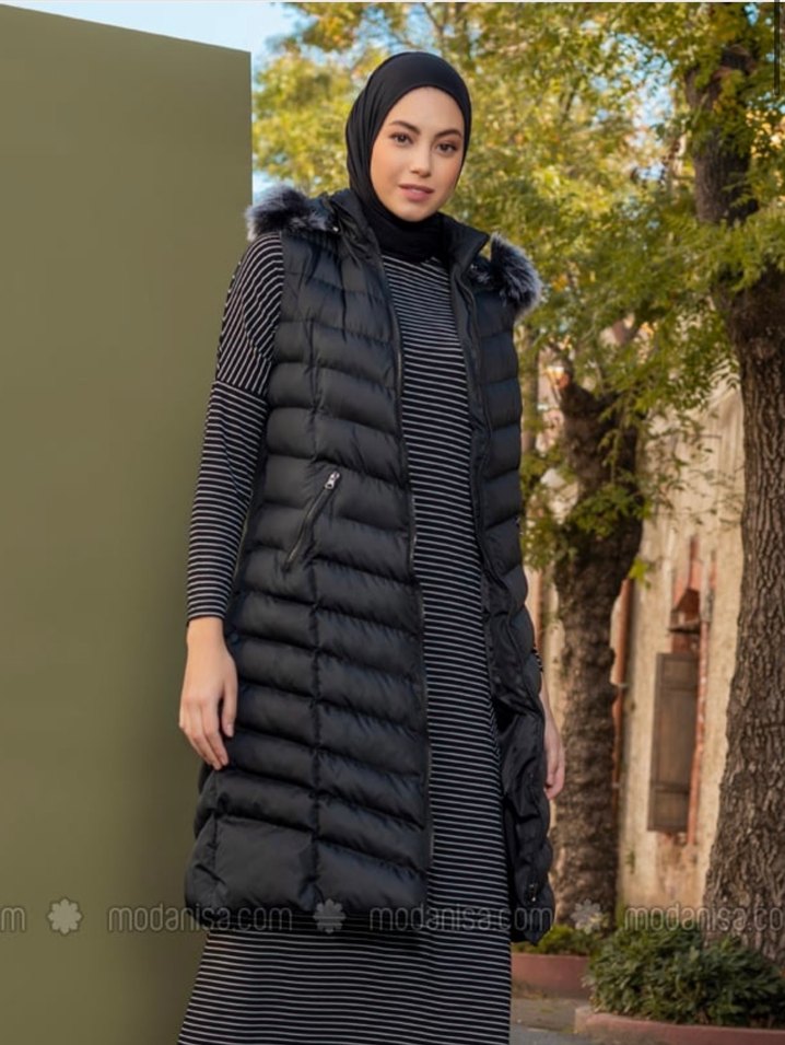 Siyah uzun şişme yelek, yüksek yakalı ve kürklü detaylara sahiptir. Yumuşak sentetik kumaştan yapılmıştır, zebra desenli ve rahat kesimlidir.