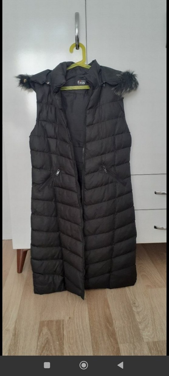 Siyah uzun, yüksek yakalı ve omuzlarında kürk detaylı kadın yeleği. Kolsuz, vücuda oturan ve sentetik kumaştan üretilmiştir.