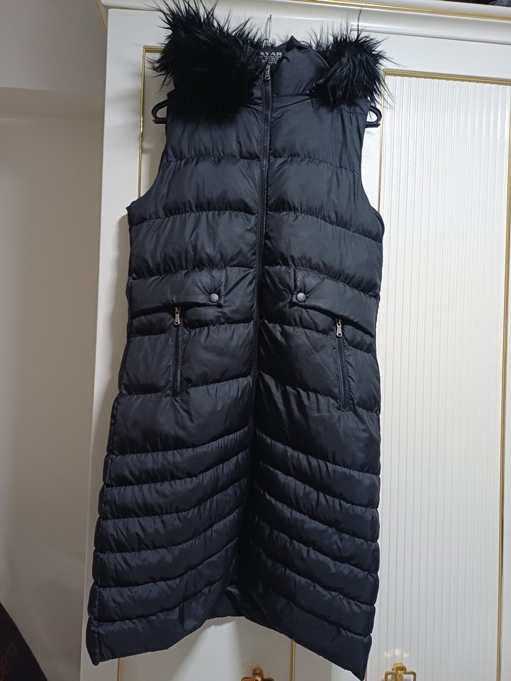 Siyah, uzun ve kolsuz yelek, yüksek yaka ve kürk detayına sahip. Günlük kullanıma uygun, trend ve rahat bir sokak stili sunar. sadece 4 5 defa kullanildi. cok temiz ürun