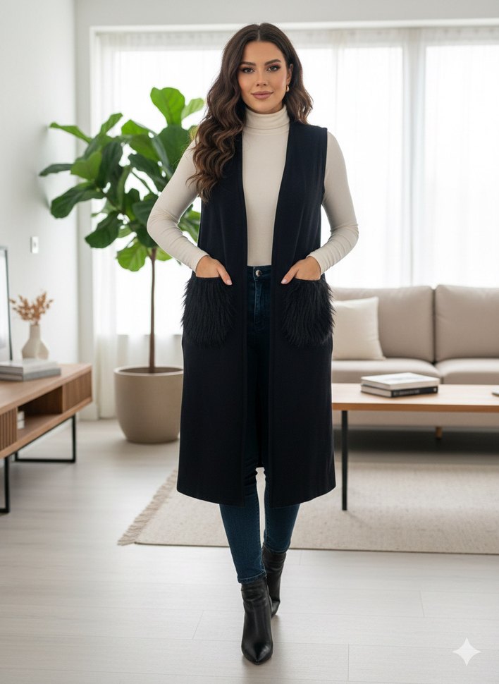 Siyah, uzun boy kadın yelek, straplez yaka ve kolsuz tasarıma sahiptir. Ceplerinde kürk detayları bulunur. Rahat kesim ve yumuşak dokuludur, 38-40 beden aralığında temiz ihtiyaç fazlasıdır