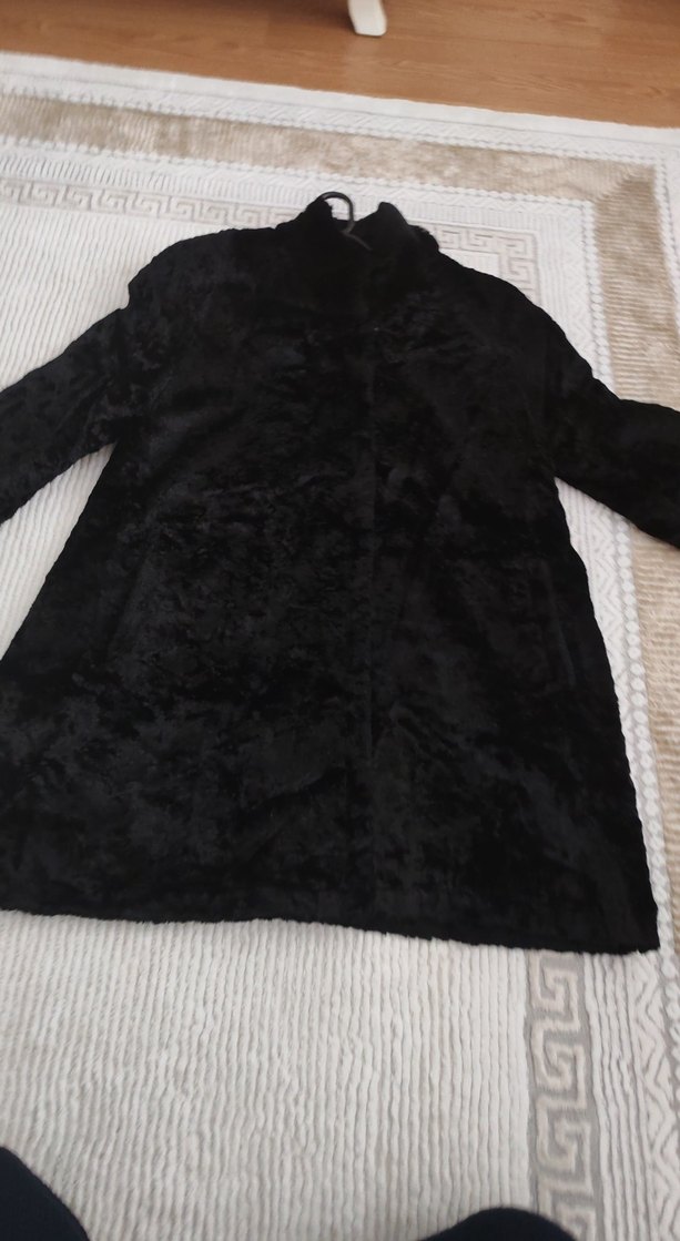 Siyah renkte, uzun kesim ve kürk detaylı, süet malzemeden üretilmiş, kadın kabanı. Sadece üst düğme yeri vardır. 3 taneden oluşuyor resimde mevcut