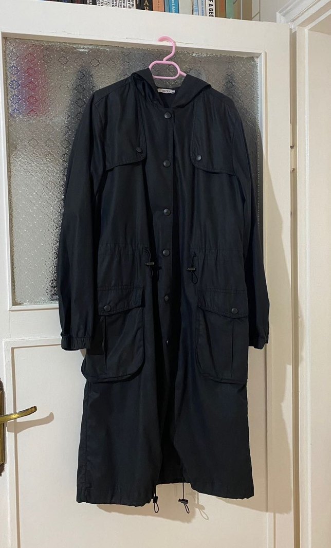 Düğmeli kapamalı, notched lapel detaylı, sentetik kumaştan yapılmış siyah uzun. Günlük rahat kullanıma uygundur.
