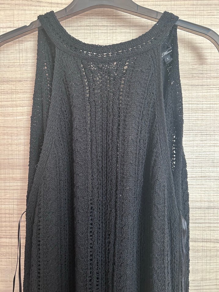 Siyah renkli, iki yani yirtmacli kolsuz ve uzun örgü elbise, bol kesimi ve rahat dokusuyla günlük yada plajda kullanıma uygundur.