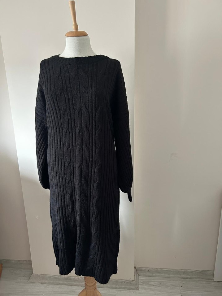 Siyah uzun örgü kadın elbise, bol kesim, yuvarlak yaka ve uzun kolludur. Günlük kullanıma uygun rahat ve sade bir modeldir.