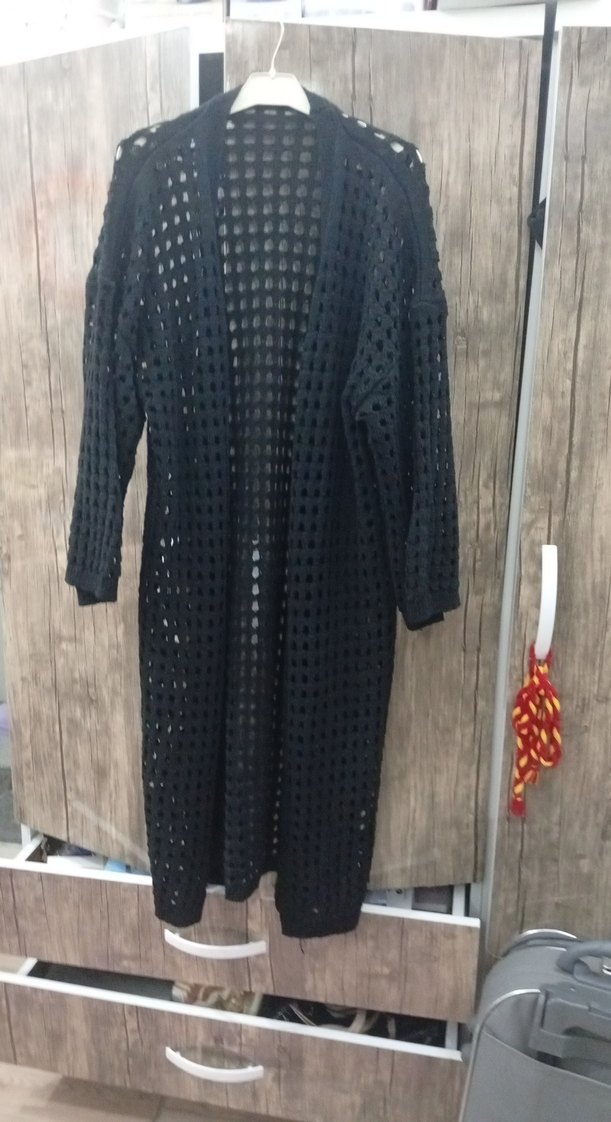 Siyah uzun örgü kumaştan, bol kesim ve yakası kesimli, bohem ve rahat tarzda kadın hırka. Günlük kullanıma uygundur.