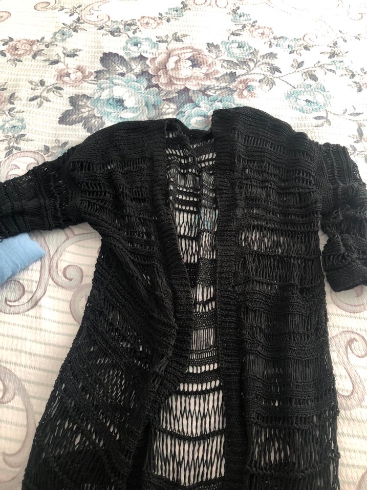Siyah uzun örgü hırka, bol kesim, V yaka ve uzun kolludur. Örgü kumaştan yapılmış, günlük kullanıma uygun rahat ve avant-garde stilde bir parçadır.
