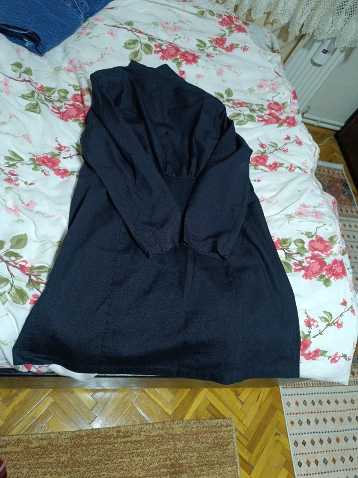 siyah, uzun boylu pamuklu ceket, bol kesim, yüksek yakalı ve uzun kollu, günlük kullanıma uygun, dökümlü tasarıma sahiptir.