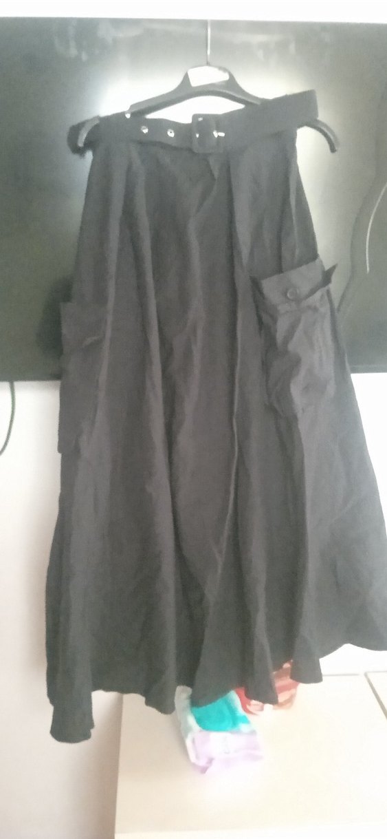 siyah renkte, paraşüt kumaştan, bol kesim ve drapeli uzun kadın eteği, ofis için gotik tarzda. ceplidr hiç kullanmadım 40 bedendir ama 38 için daha uygun ,bana dar geldiği için satıyorum.