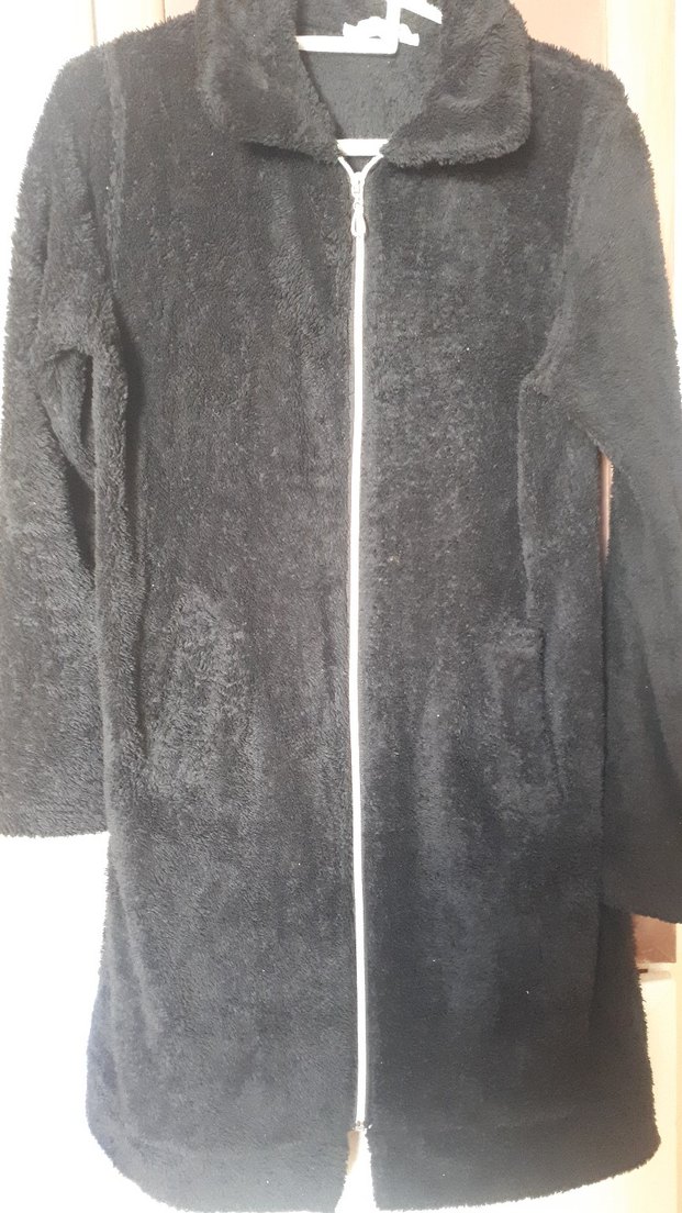 siyah renkli, uzun boy ve bol kesim peluş kumaştan yapılmış kadın kaban. Uzun kollu ve kürk detaylı, kesik yaka detayıyla sade bir tasarıma sahiptir.