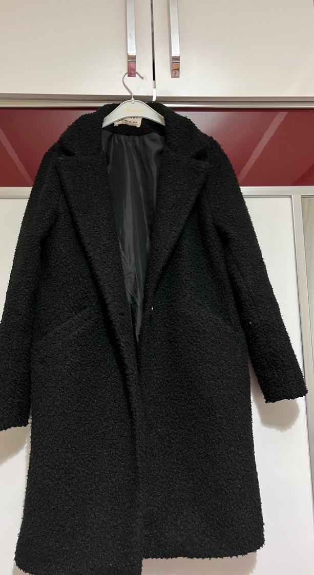 Siyah uzun kaban, yakasında kürk detaylı yumuşak peluş kumaşa sahiptir. Regular kesim ve uzun kolludur, rahat sokak stiline uygundur.
