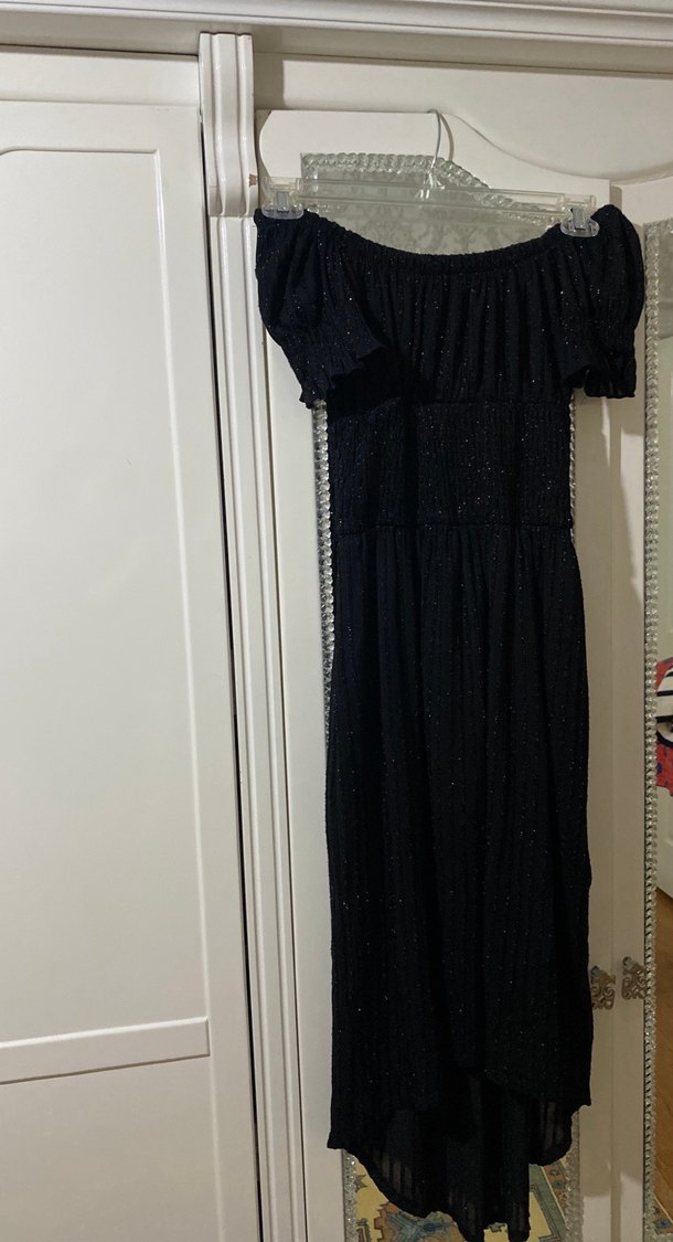 Siyah uzun pilili, tek renkli, keten kumaştan, tekne yaka ve askılı kollu dar kesim kadın elbise. Romantik buluşmalar için uygundur. 38-42 aralığında