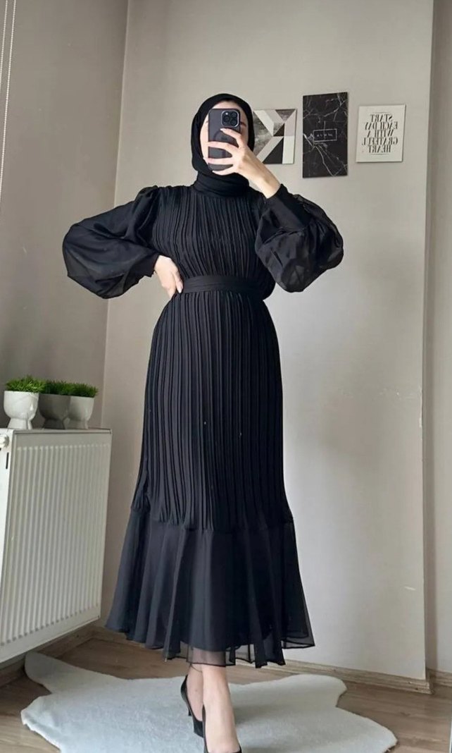 Kiralanabilir temizdir (500₺) Siyah uzun piliseli elbise, yüksek yaka ve uzun kolludur. Bol kesim ve mütevazı stilde, sentetik kumaştır Özel ve. Günlük kullanım için uygundur.