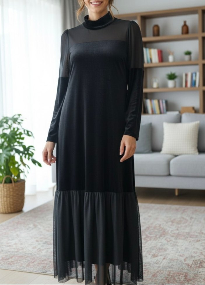 Uzun siyah elbise, piliseli detaylı, uzun kollu ve yüksek yakalı, bol kesim gotik tarzda. Yumuşak sentetik kumaştan yapılmıştır.