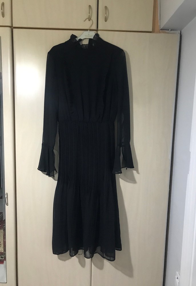 Yüksek yakalı ve uzun kollu, piliseli tasarıma sahip siyah uzun elbise, klasik gotik tarzda ve ofis için uygundur. Sentetik kumaştan, düz kesimdir.