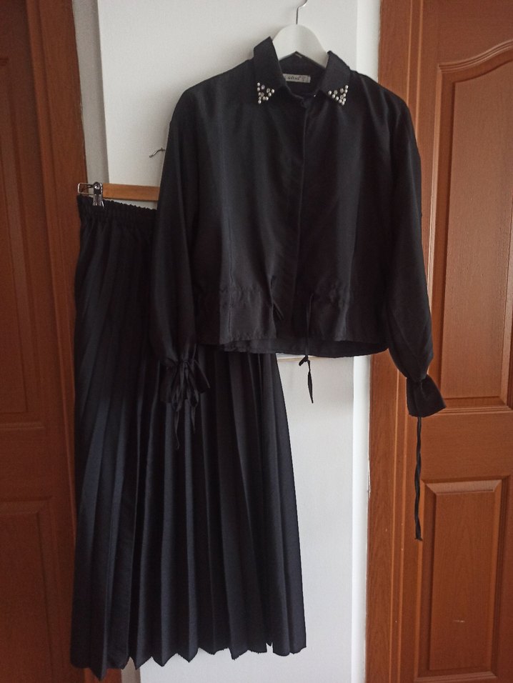Siyah, uzun piliseli etek ve askılı kollu, kesik yaka yakalı, salaş kesim ipek gibi dokulu üstten oluşan gotik tarzda kadın takımı.