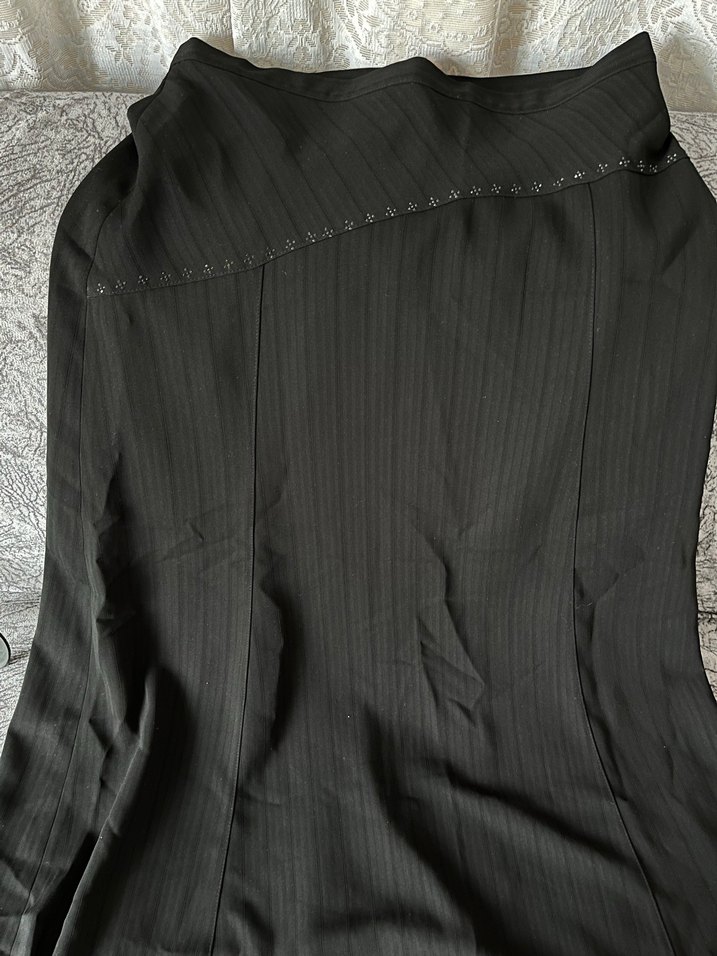 Siyah, uzun ve piliseli, ince çizgili dokulu, vücuda oturan kadın eteği.