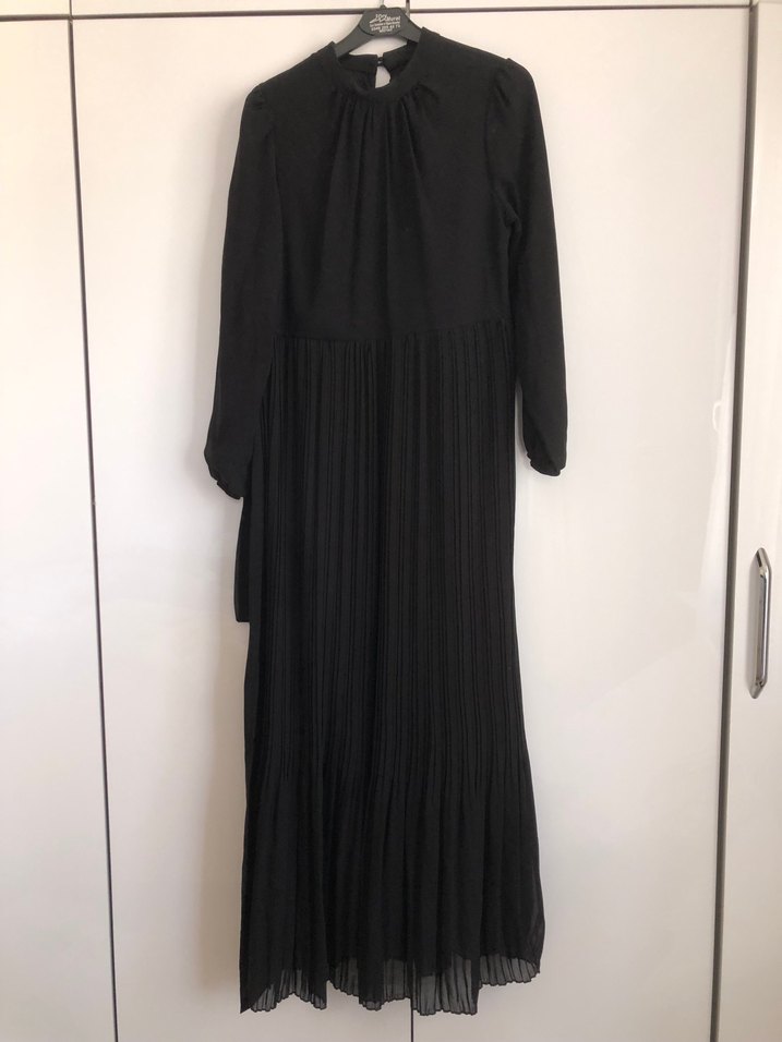 Siyah uzun şifon elbise, piliseli ve yüksek yakalıdır. Uzun kollu, minimalist tarzda günlük kullanıma be davetlere uygundur.