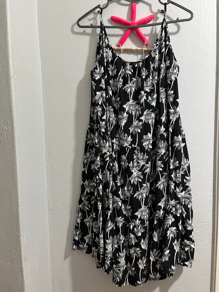 Siyah elbise, straplez yaka ve ince askılarla. Pliseli ve tie-dye desenli, rahat kesim ve sentetik yumuşak kumaştan günlük kullanıma uygun.