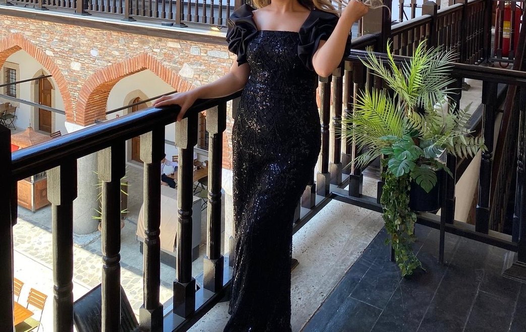 Siyah uzun abiye elbise, drapeli tasarım ve kare yakaya sahip. Kabarcık kol detayları ve parlak pul payet dokusu ile parti için ideal. ✨