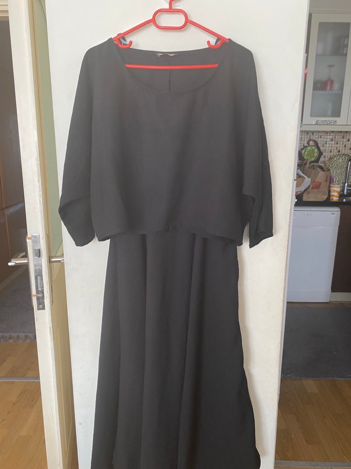 Siyah renkli, uzun boy, bol kesim elbisesi. Kayık yaka ve kısa kollu, dökümlü tasarıma sahip, sentetik kumaftan üretilmiştir. Ofis kullanımı için uygundur.