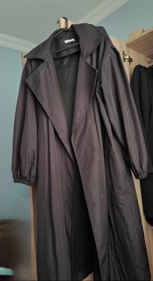 siyah renkli, drapeli detaylı uzun trençkot. Notch yaka ve uzun kollu, rahat kesim, sentetik kumaştan üretilmiştir. Günlük sokak stili için uygundur.