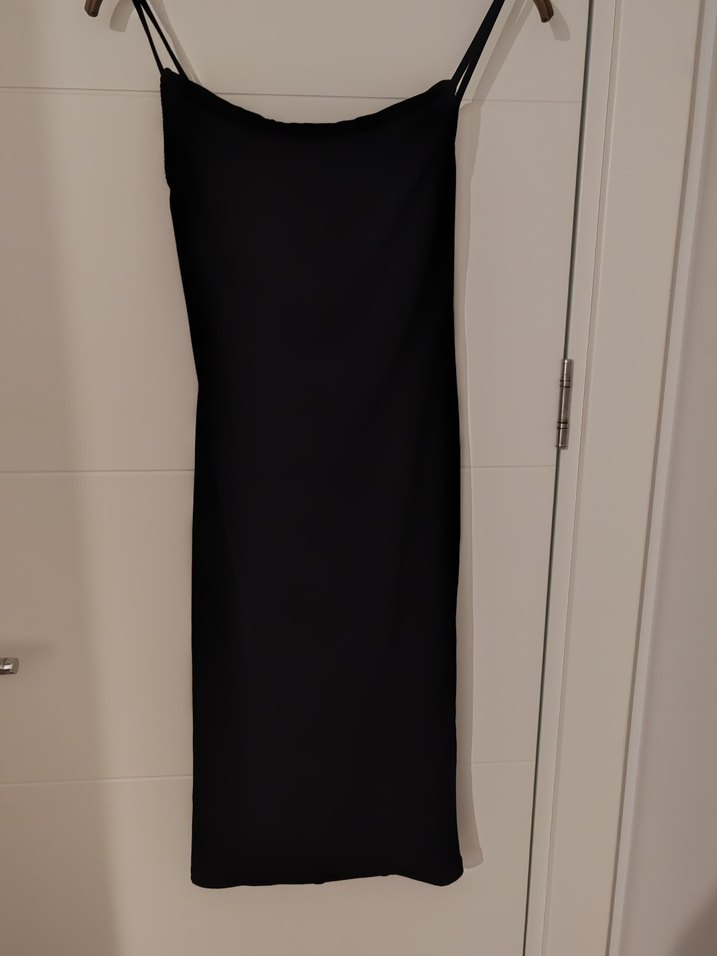 Bu siyah, uzun ve sade kadın elbisesi, düz yakalı ve kolsuz tasarıma sahiptir. Minimalist tarzıyla günlük kullanıma uygun, zahmetsiz şıklık sunar. Cesur gotik tarz için ideal.