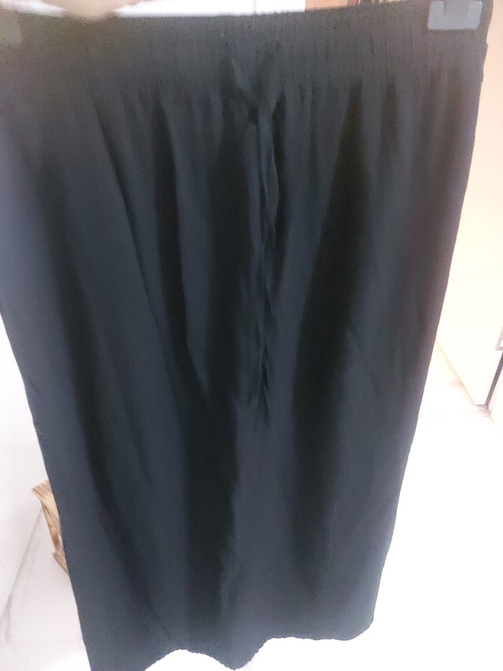 Siyah uzun etek, yumuşak ve dökümlü kumaş ile salaş bir görünüme sahip, minimalist ve gotik tarzı yansıtır, ofis kullanımı için uygundur.