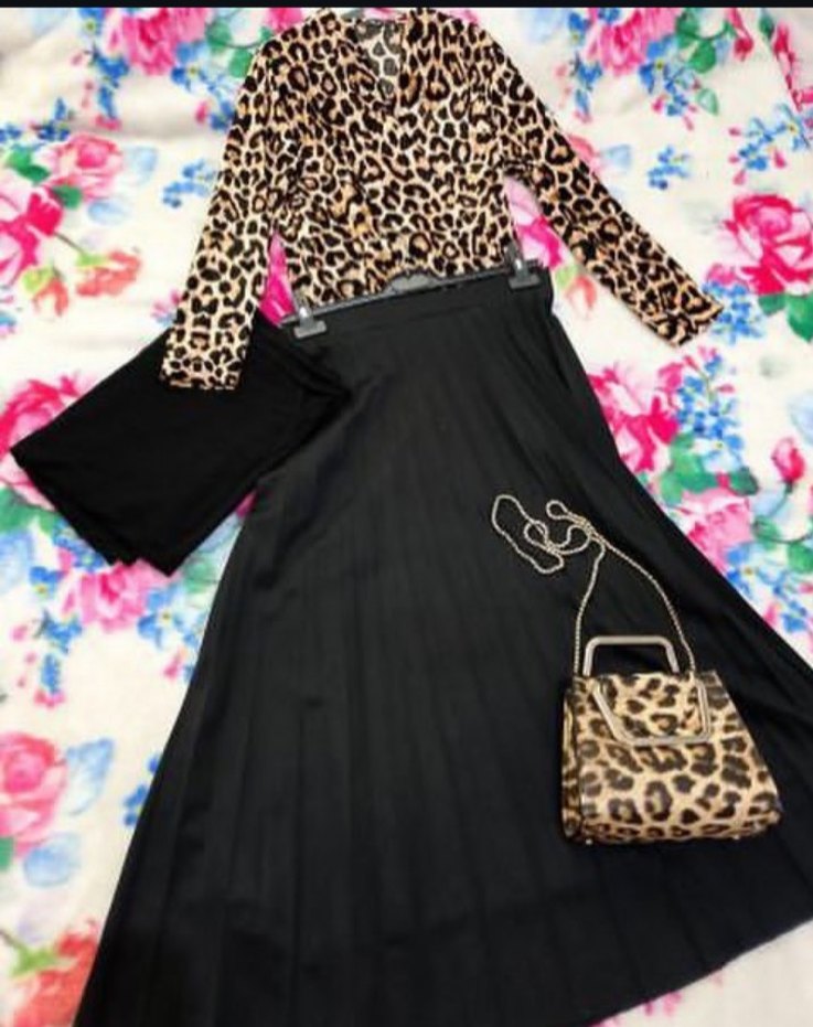 Siyah Uzun Salaş Etek leoparlı çıtçıtlı body çanta ve şaliyla