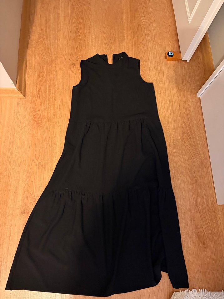 Siyah uzun, bol kesim elbise, yüksek yakalı ve kolsuzdur. Fırfır detaylarıyla minimalist gotik stile uygundur.