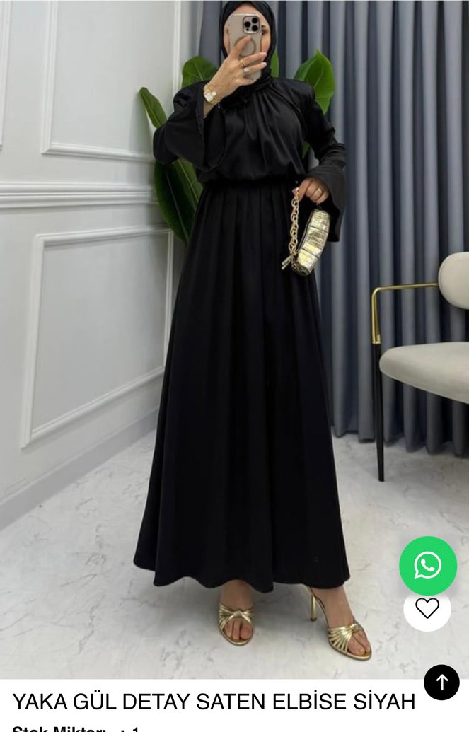 Siyah uzun, salaş kesim elbise, yüksek yakalı ve drapeli detaylıdır. İnce ve parlak kumaştan, minimalist tarzda, askılı kolludur.