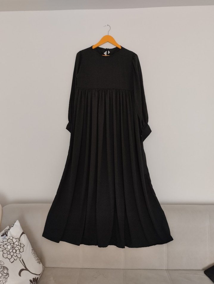 Siyah uzun elbise, yüksek yaka ve uzun kollu, salaş kesimli, dökümlü ve ipeksi kumaştan. Minimalist, mütevazı goth tarzında, günlük kullanım için uygun.