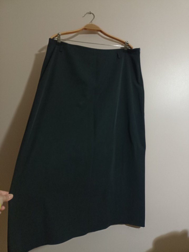 Siyah uzun, salaş kesim ve dökümlü tasarıma sahip, sentetik kumaştan yapılmış kadın eteği. Ofis için minimalist ve avangart tarzda uygun. bel 50 basen 63 uzunluk 92 cm