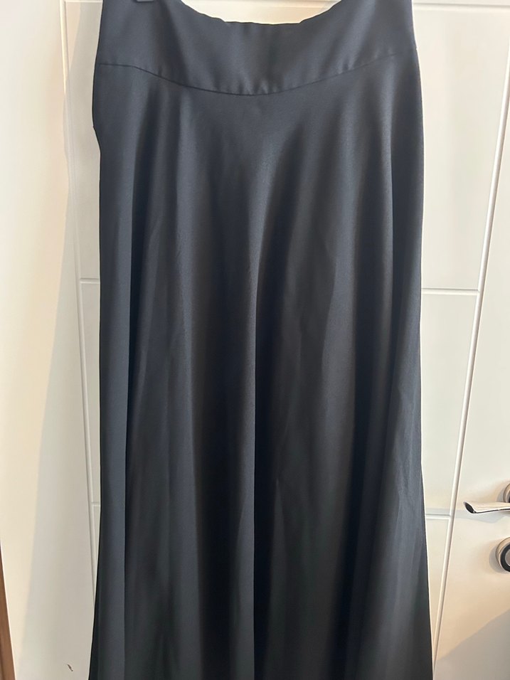 Siyah uzun, salaş kesim ve drapeli kadın eteği, ipeksi kumaştan üretilmiştir. Minimalist goth tarzıyla ofis için uygundur.
