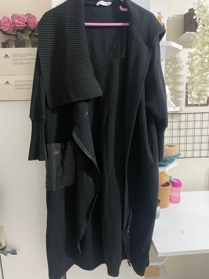 Bu siyah uzun hırka, salaş kesim, drapeli detaylar ve kesik yaka ile tasarlanmıştır. Sentetik kumaştan, uzun kolludur ve sokak stili sunar.