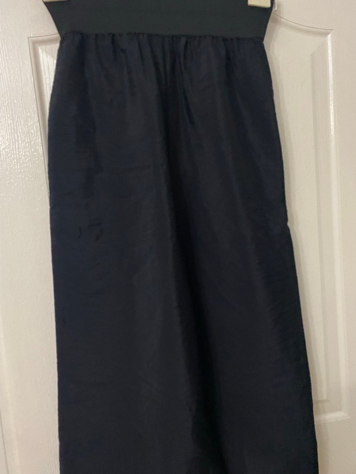 Siyah, uzun boy, ipeksi dokulu ve salaş kesim kadın eteği. Minimalist ve sade tarzıyla günlük kullanıma uygundur.