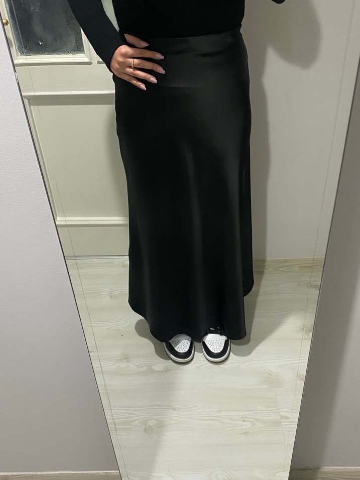 Siyah uzun ve salaş kesim etek, ipeksi dokusuyla rahat ve şık bir görünüm sunar. Günlük kullanıma uygundur. Boyu 100cm Beli. Hem fermuarlı hem lastikli
