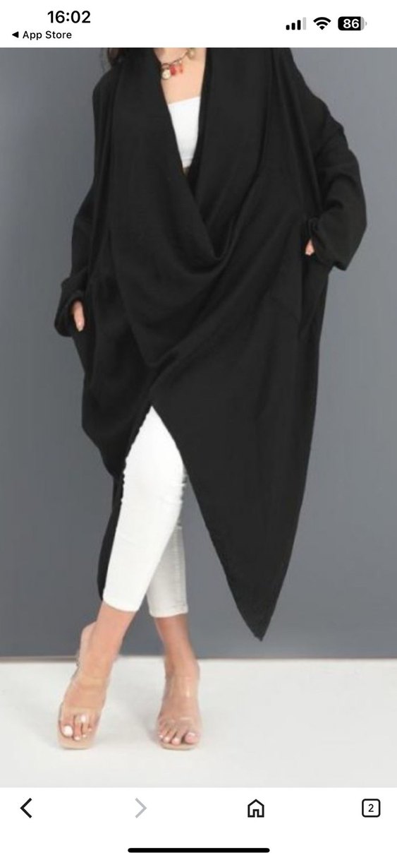 Siyah uzun panço, yüksek yakalı, uzun kollu ve salaş kesimlidir. Yumuşak ve sıcak dokulu kumaştan üretilmiştir.