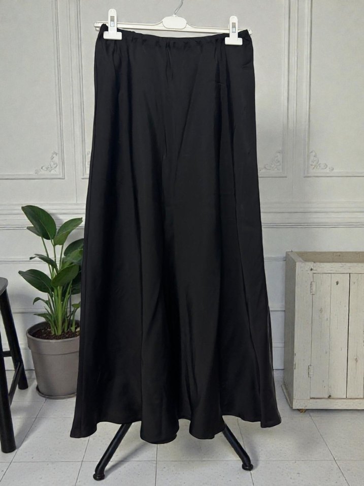 Siyah uzun saten etek, salaş kesim ve drapeli tasarımıyla minimalist, mütevazı goth tarzına uygun ofis kullanımı için idealdir.