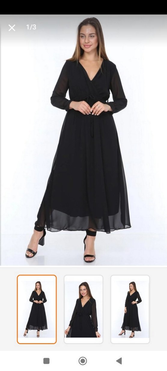 Siyah uzun elbise, salaş kesim ve drapeli tasarıma sahiptir. İnce askılı V yakası ve ipeksi kumaşı ile ofis için uygundur.
