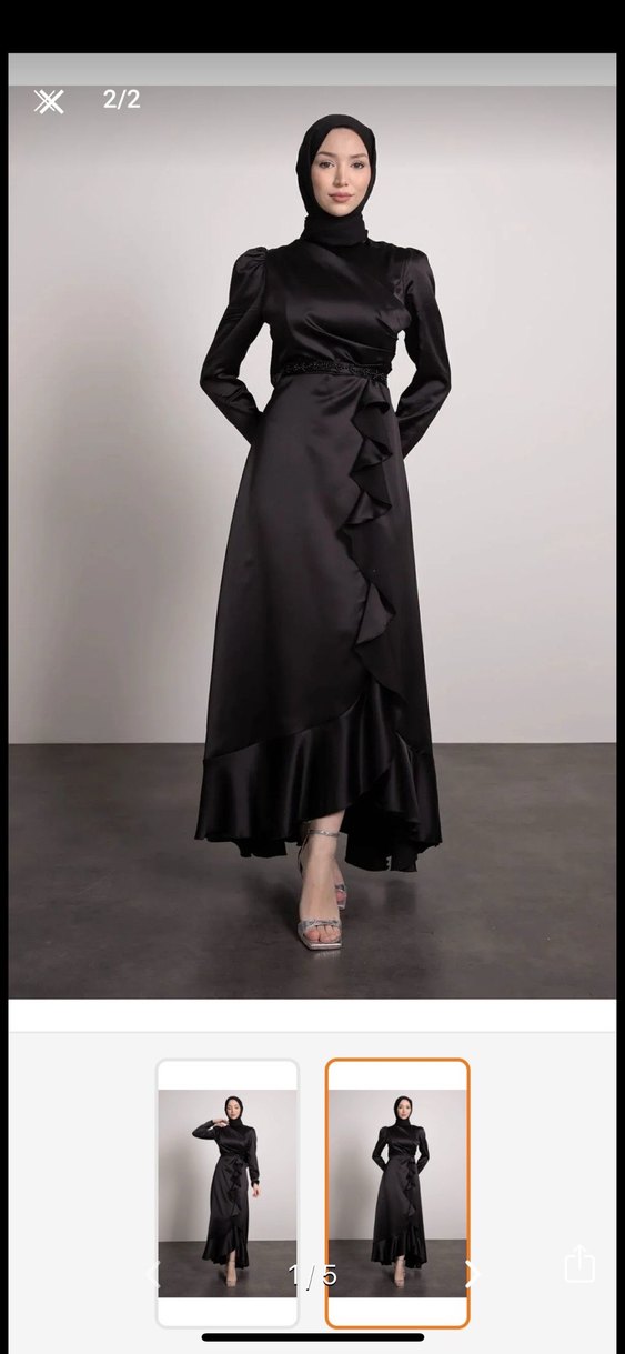 Siyah uzun saten elbise, yüksek yakalı ve fırfırlı detaylara sahiptir. Uzun kollu ve klasik zarafet stilindedir, düğün için uygundur. Desensiz ve koyu, gösterişli gotik görünüme sahiptir.