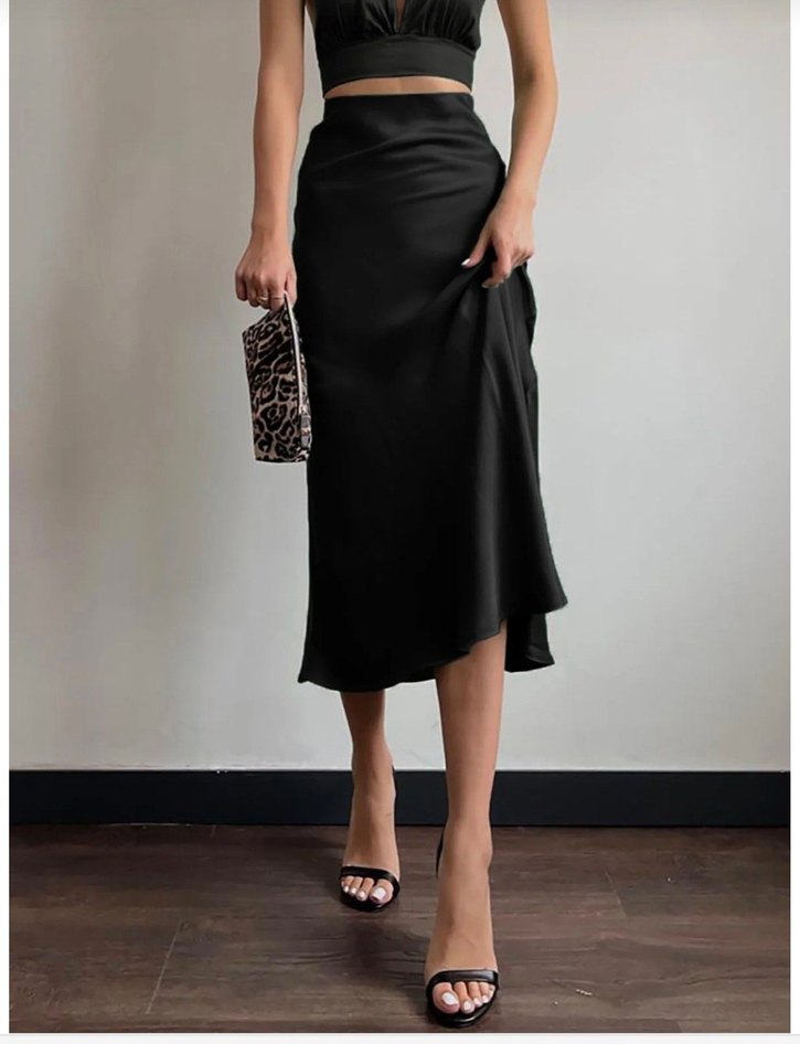 Siyah uzun saten etek, gevşek kesim ve dökümlü tasarıma sahiptir. Yılan desenli dokunuşu romantik buluşmalar için uygundur. uyguna bırakıyorum