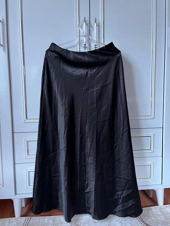 Siyah renkte, saten,uzun ve bol kesim kadın eteği.