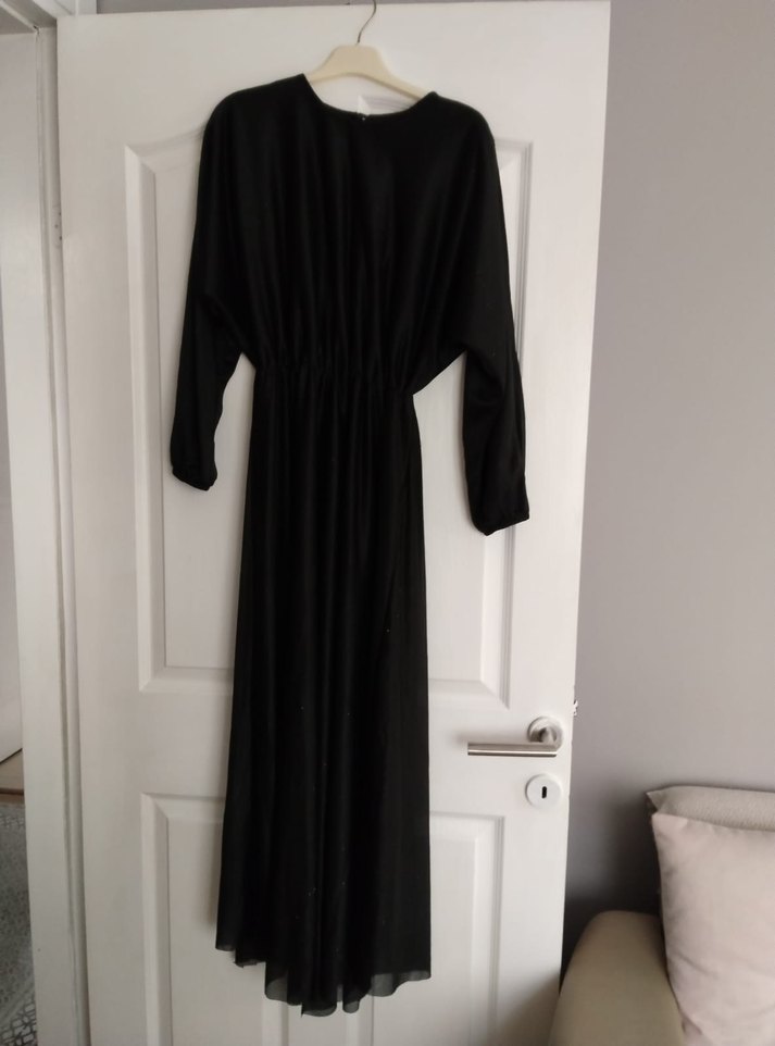 Siyah uzun keten elbise, bol kesim ve drapeli detaylara sahiptir. uzun kolludur, minimalist gotik tarzıyla ofise uygundur.