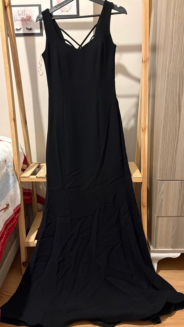 V yakalı, ince askılı ve drapeli detaylara sahip, siyah uzun ve vücuda oturan gotik elbise.