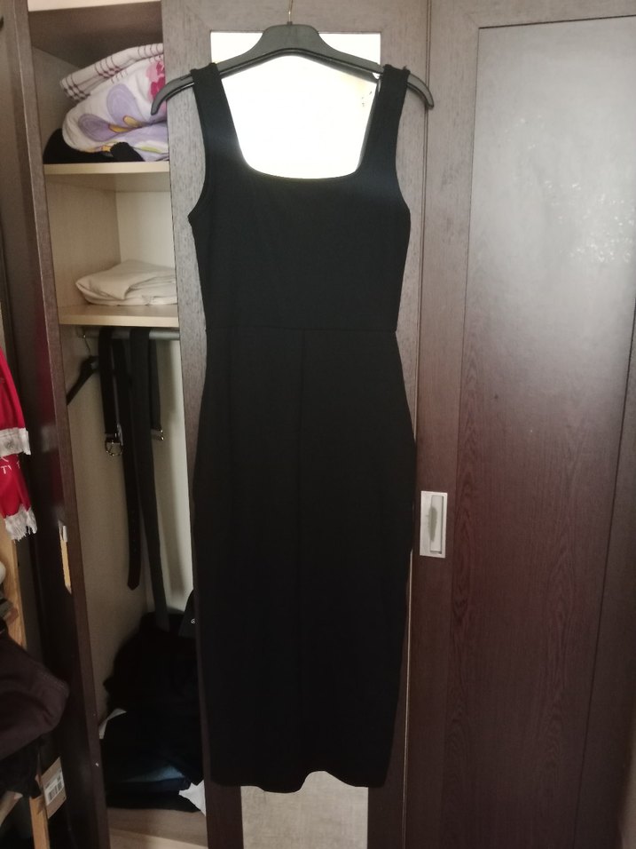 Siyah uzun elbise, kolsuz ve straplez yakaya sahip, düz ve minimal tasarımıyla günlük kullanıma uygun şık bir parçadır.