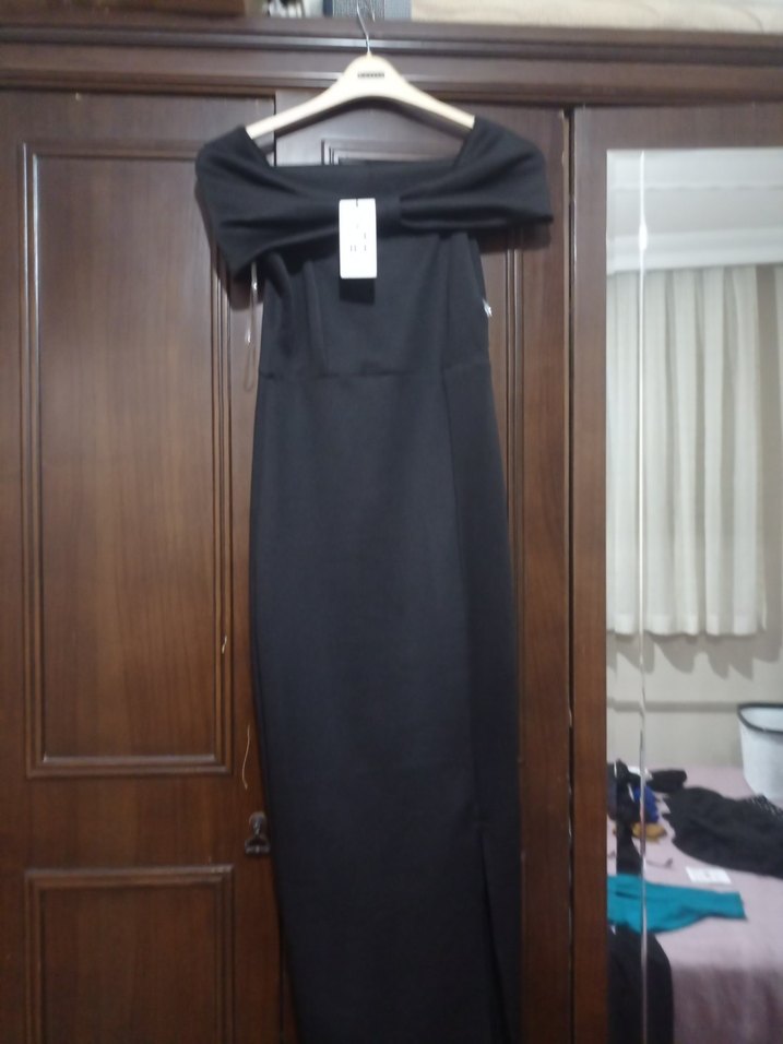Siyah renkte, uzun boyda, straplez ve detaylı, klasik ve minimalist goth tarzında, ofis için uygun abiye elbisedir.